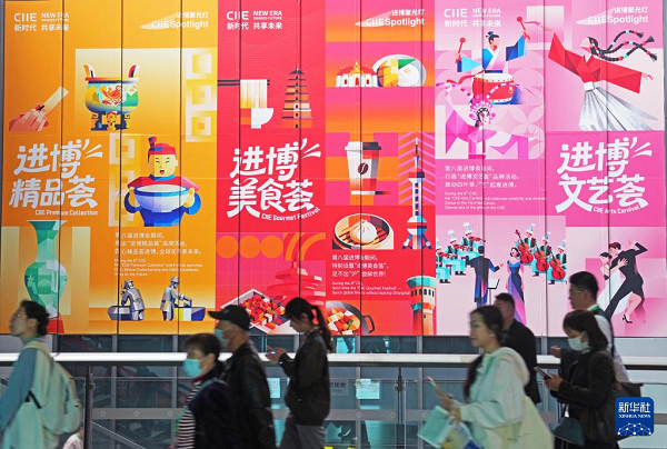 11月8日,在国家会展中心(上海),观众走过“进博精品荟”“进博美食荟”“进博文艺荟”的巨幅海报。进博会不仅是全球商品和服务的交易平台,更是中外文化和理念交流的盛会。新华社记者 刘颖 摄