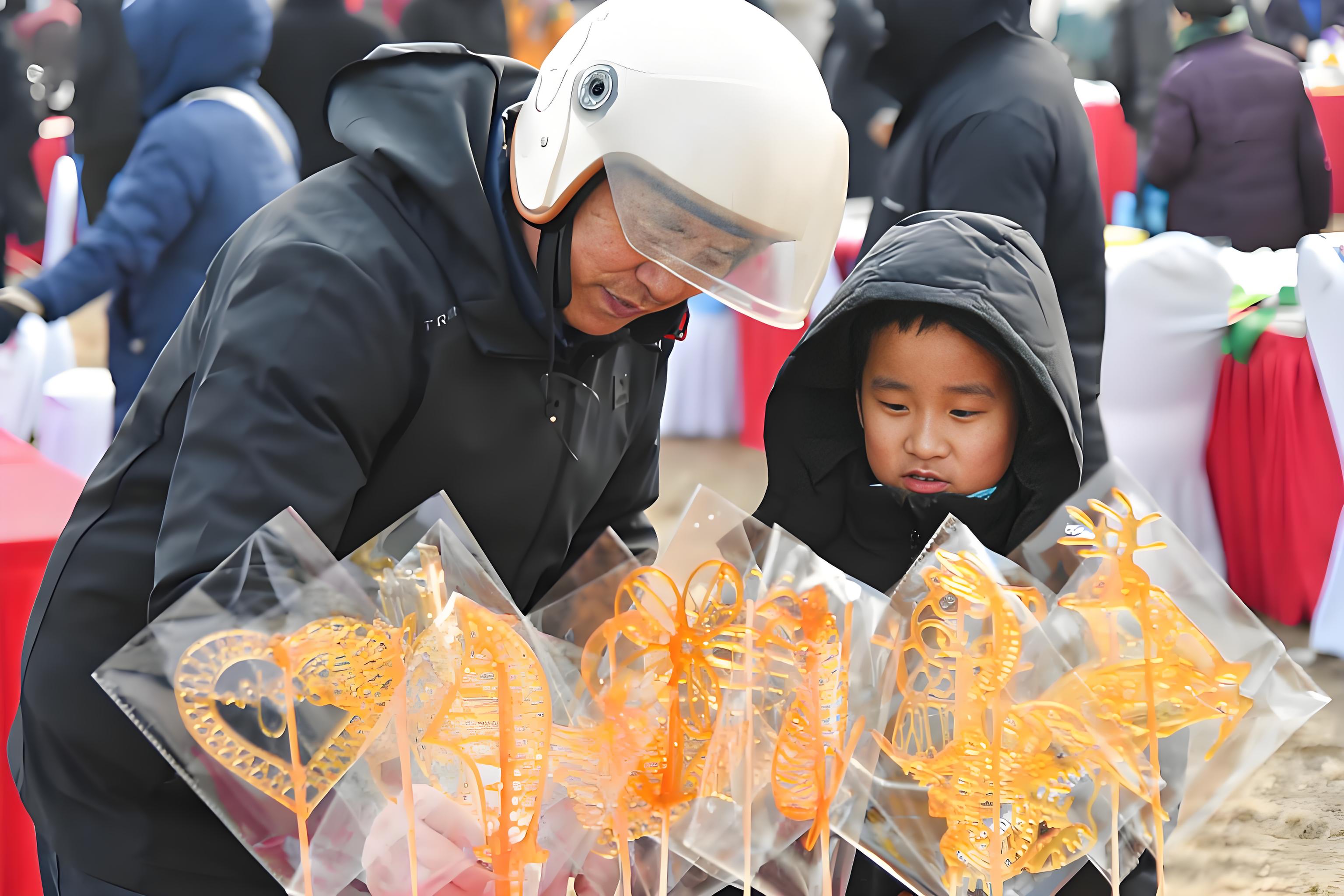1月30日,小朋友在山东泰安大集上挑选糖画。新华社记者 朱峥 摄